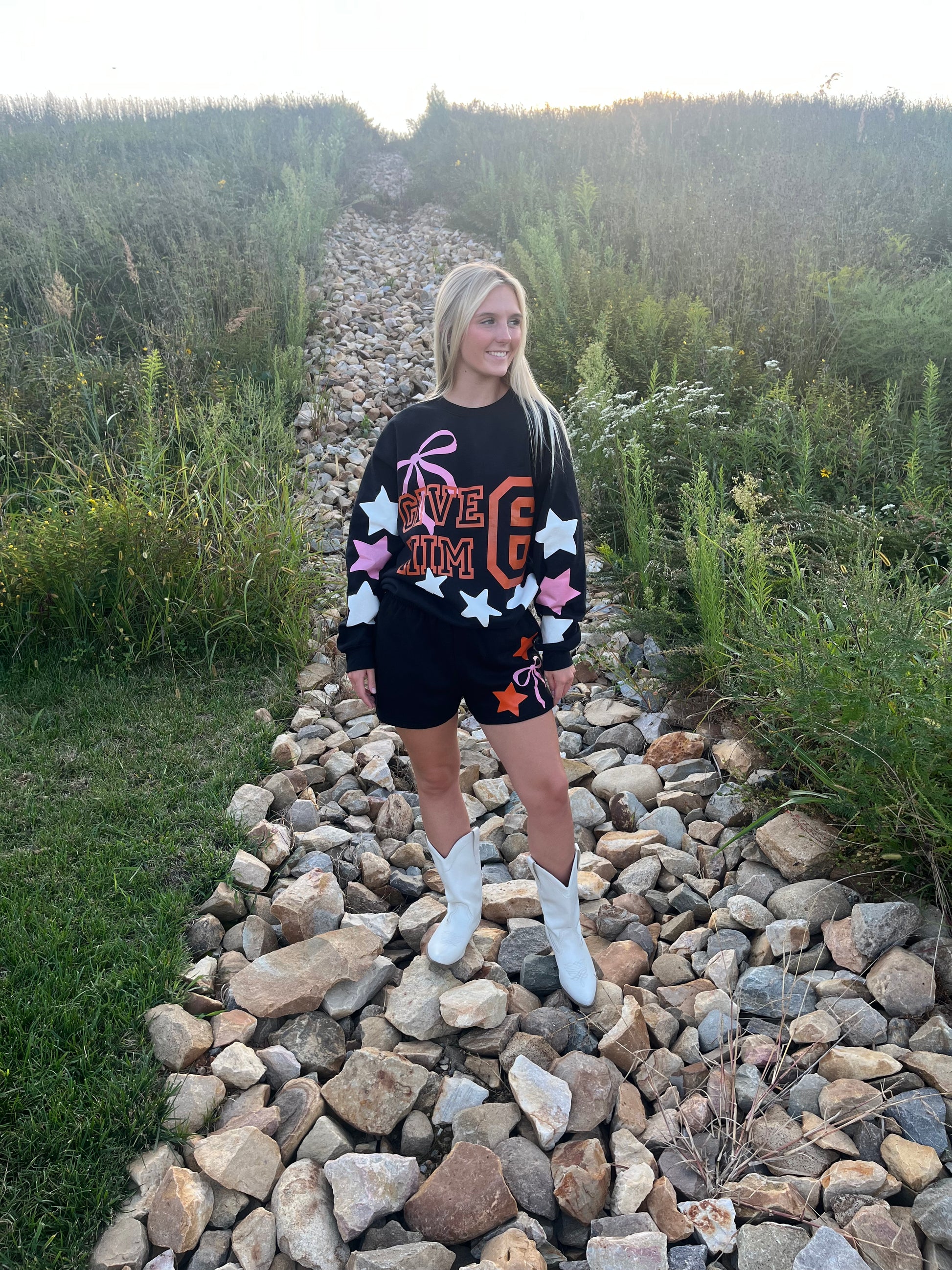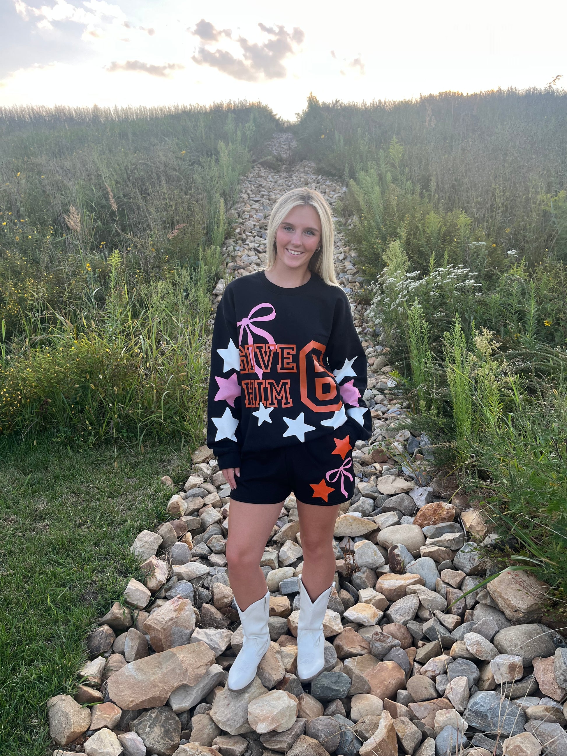 A black sweat set with orange white and pink designs( shorts and crewneck included)